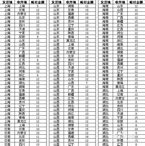 那么保险赔偿的运费是多少呢?很多人都不清楚,那么下面一张图片就来告诉大家赔偿的运费额度吧!(大家根据自己的发货地,和收货地来看。)