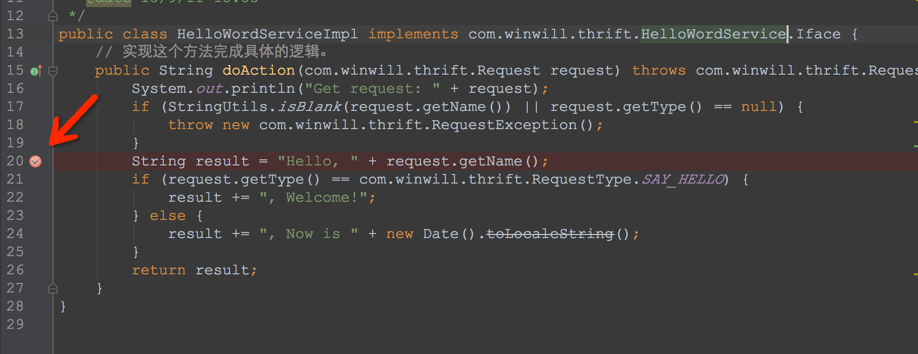 远程debug模式已经开启,现在可以在需要调试的代码中打断点了,比如:
