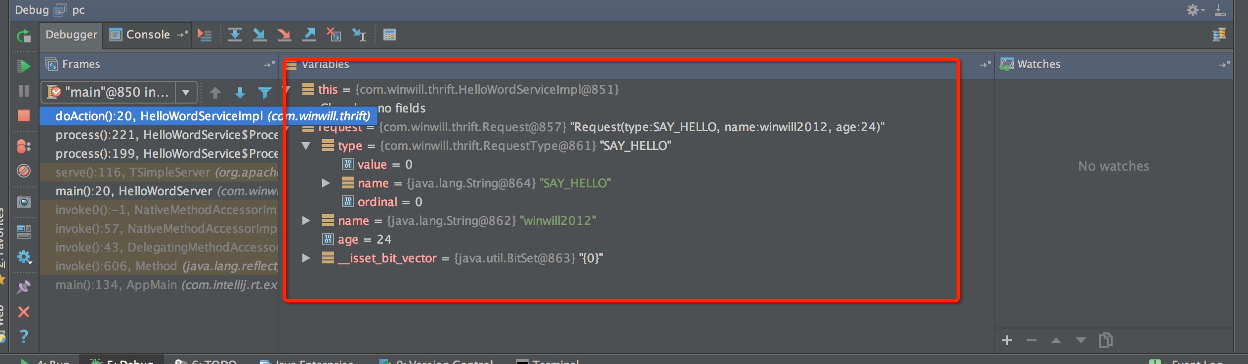 现在在本地发送一个到远程服务器的请求,看本地控制台的bug界面,划到debugger这个标签,可以看到当前远程服务的内部状态(各种变量)已经全部显示出来了,并且在刚才设置了断点的地方,也显示了该行的变量值。
