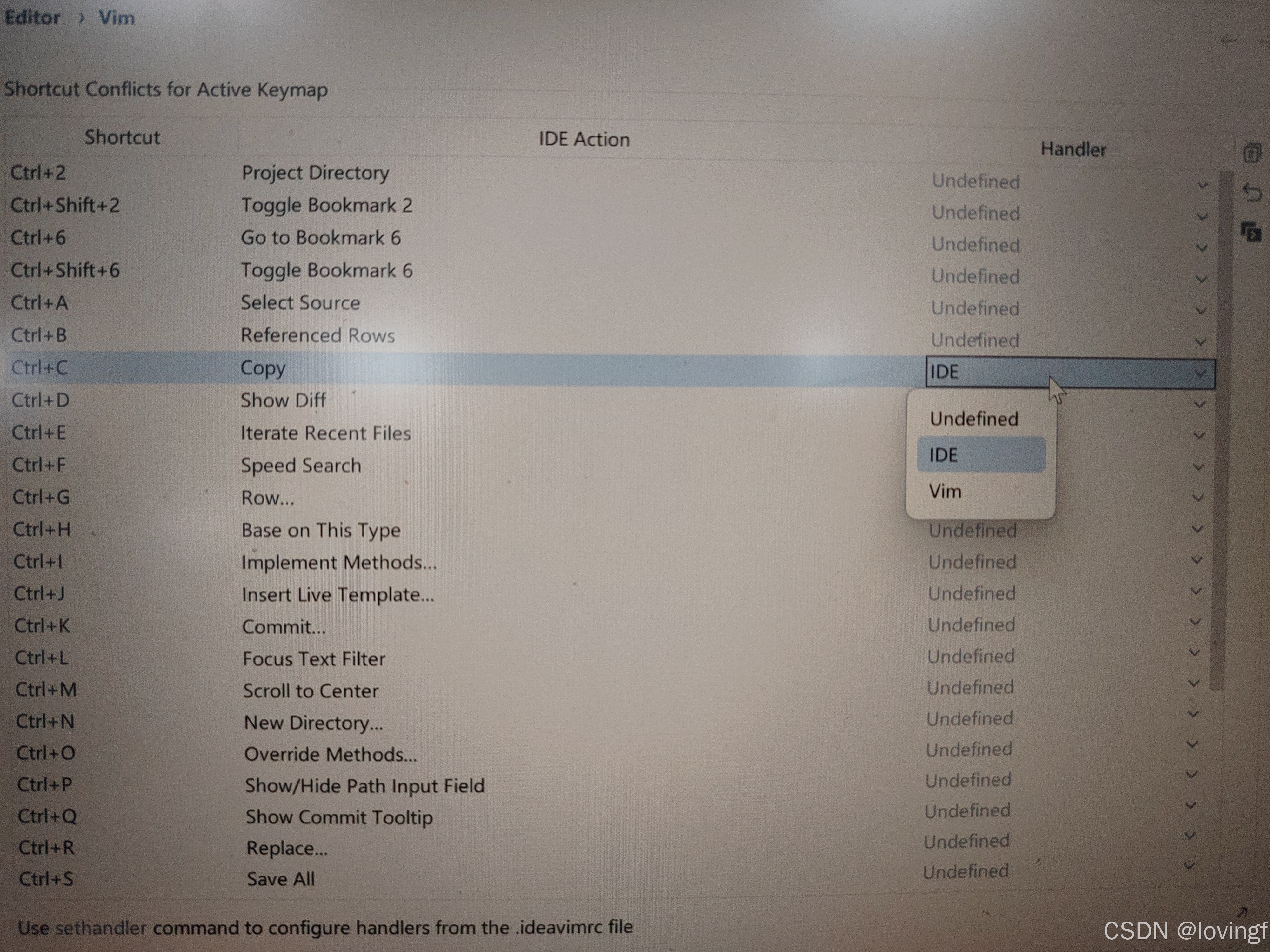 集合ideavim后,ctrl+c和ctrl+v就难以使用 可按以下方法进行修改。 1.点击右下角的vim图标 2.点击settings 3.找到其中的ctrl+c,将其选择为IDE,即可使用与windows相同的快捷键了
