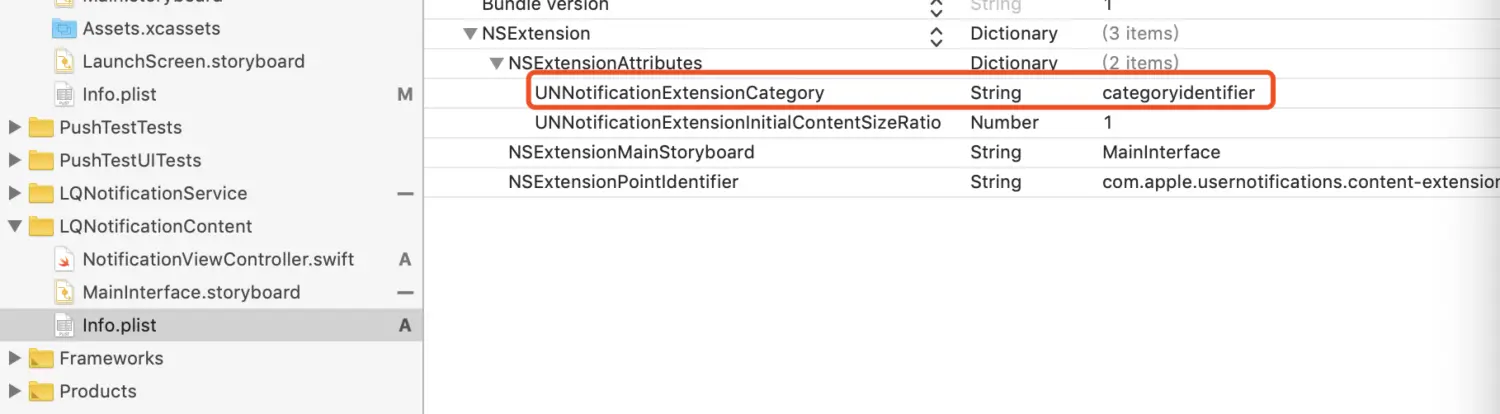 然后在该扩展下的Info.plist中添加该Category的identifier,对应着UNNotificationExtensionCategory字段: