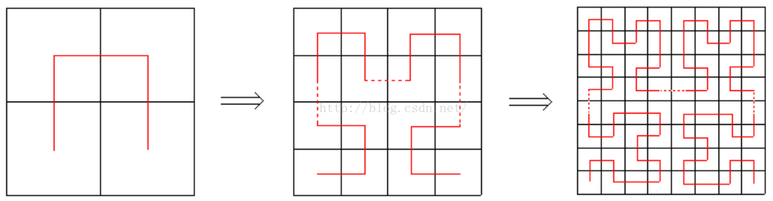 希尔伯特曲线是以下一系列分形曲线 Hn 的极限。我们可以把Hn 看作一条覆盖 2n × 2n 方格矩阵的曲线,曲线上一共有 2n × 2n 个顶点(包括左下角起点和右下角终点),恰好覆盖每个方格一次。
