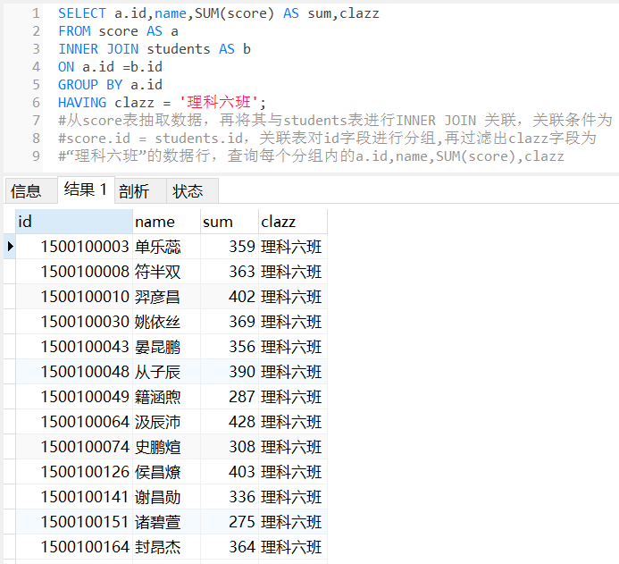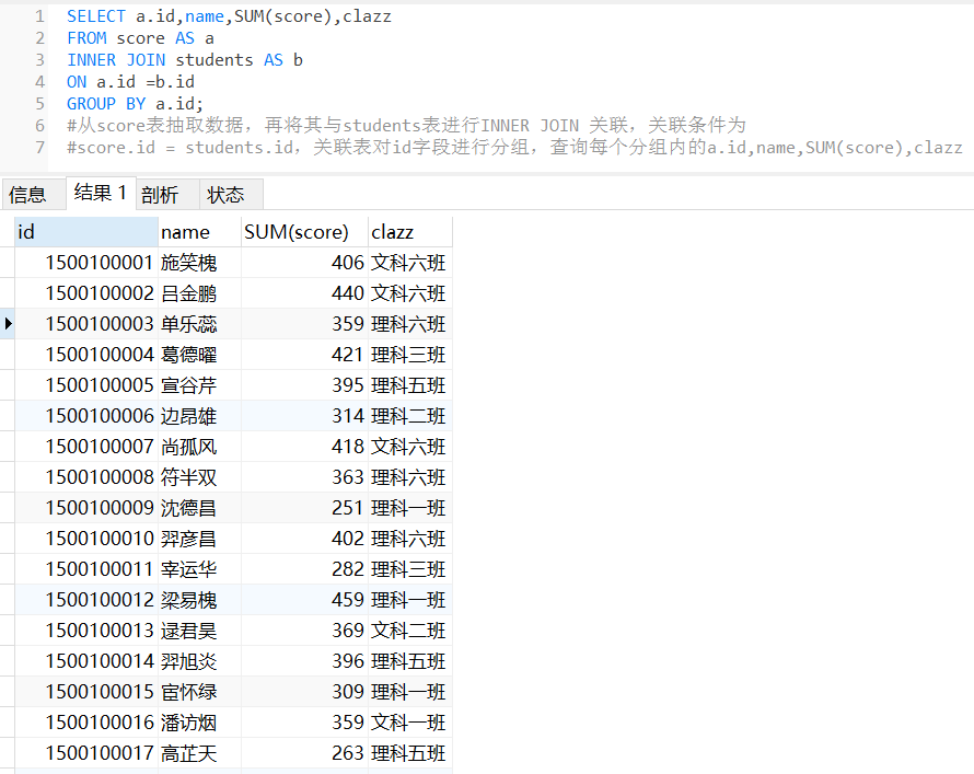 SELECT a.id,name,SUM(score) AS sum,clazz