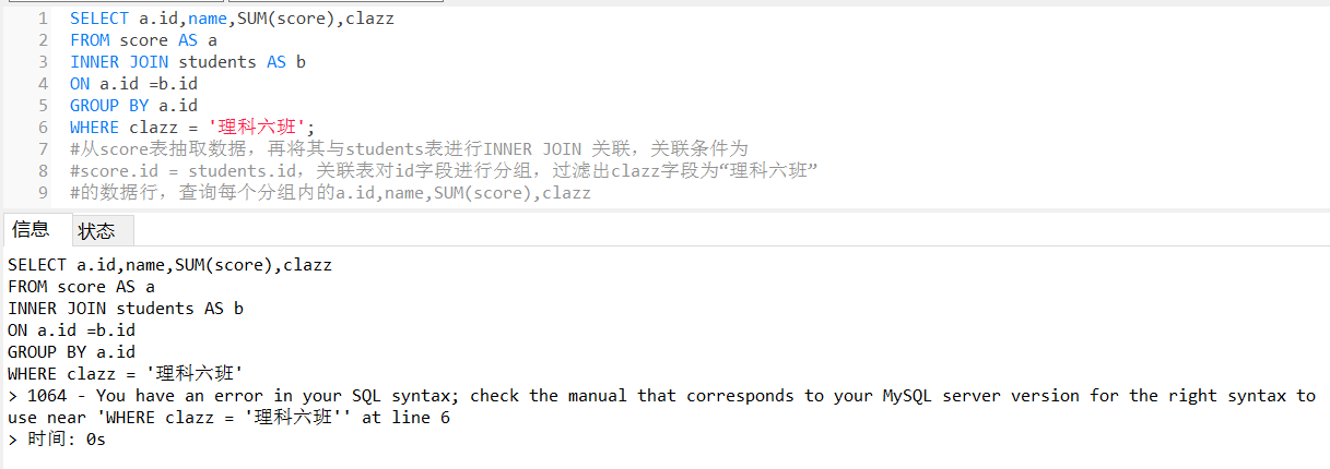 很明显,出现报错情况, WHERE clazz = ‘理科六班’ 这条语句出现问题