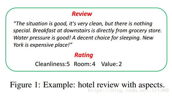 仅仅预测文本情感通常是不够的,因为一个评论文本通常涉及产品和服务的不同方面,如下所示,并且用户比起aspect的评估更喜欢提供整体的评估,因此,文本级别的多aspect情感分类任务很有意义,即预测每个aspect的分数,而不是总体的分数。