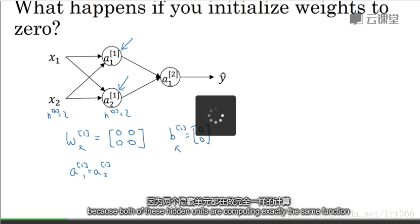 - 初始化权重非常重要,如果把W全部初始化为0,那么所有的隐藏单元都是对称的,不管做多久梯度下降都毫无意义,比如,