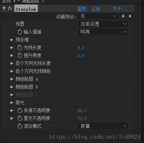 新建调整图层,选择 效果 Trapcode Starglow 添加星光效果,参数为下图,可以根据需求进行调整