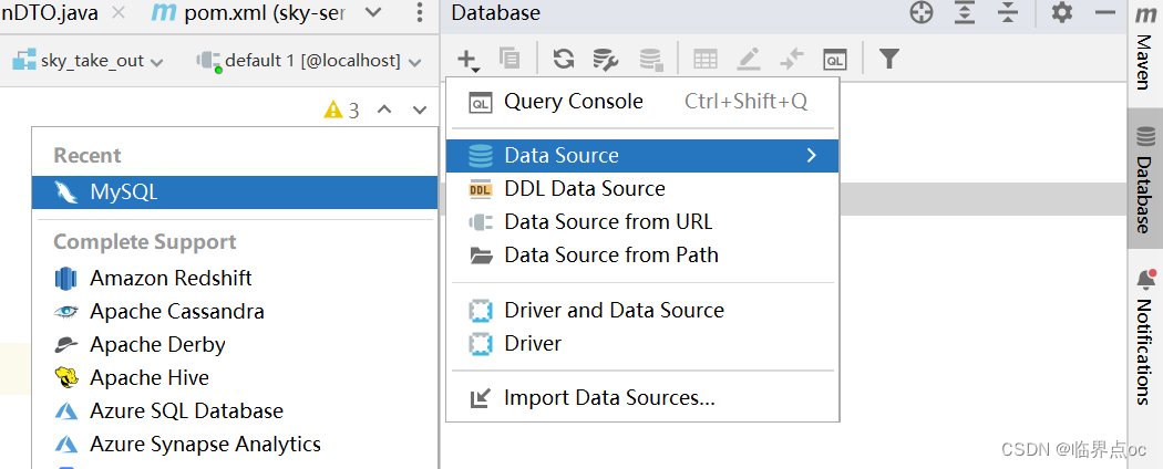 2. 使用IDEA连接数据库,选择MySQL,然后填写相关信息。最后,刷新一下。