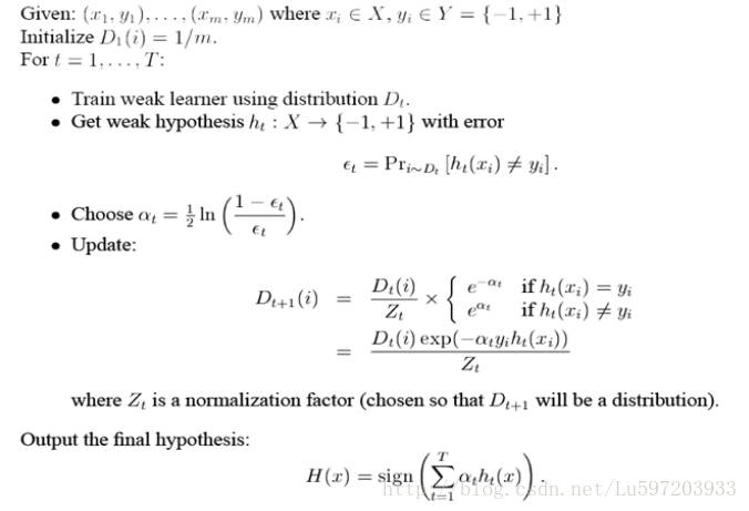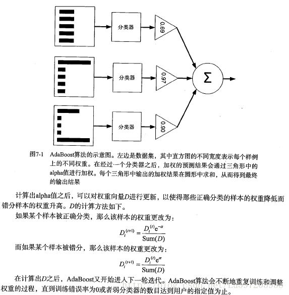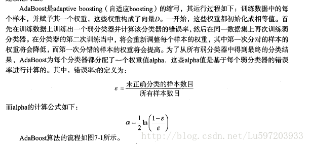 5:adaboost算法:机器学习实战这本书上的描述和论文中的描述是一致的,见下面(前两幅是书中描述,后一副是论文中描述)。