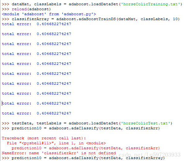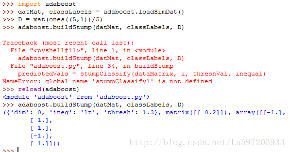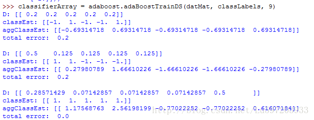 注意这里有三层循环构建了单层决策树,最外层循环为遍历特征,次外层循环为遍历的步长,最内层为是否大于或小于阀值。构建的最小错误率为加权错误率,这就是为什么增加分错样本的权重,因为分错样本的权重增加了,下次如果继续分错,加权错误率会很大,这就不满足算法最小化加权错误率了。此外,加权错误率在每次迭代过程中一定是逐次降低的。。