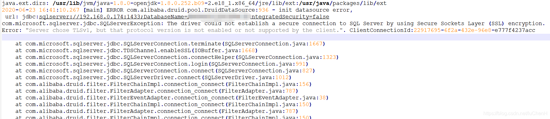 com.microsoft.sqlserver.jdbc.SQLServerException: The driver could not establish a secure connection to SQL Server by using Secure Sockets Layer (SSL) encryption. Error: "Server chose TLSv1, but that protocol version is not enabled or not supported by the client.". ClientConnectionId:22917695-6f2a-432e-96e8-e777f4237acc
