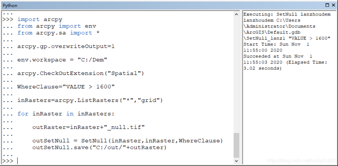 在ArcGIS10.6中,以GRID格式的DEM数据为例,将高程值大于1600的像元设置为空值的批处理代码为:
