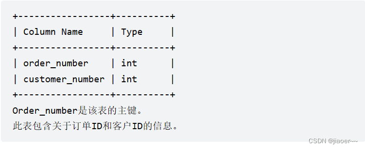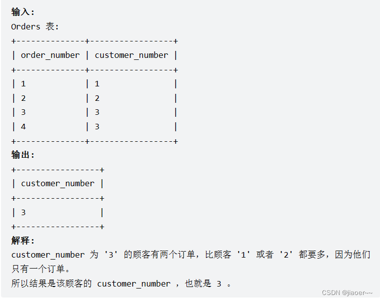 1.题目要求查询下了 最多订单 的客户,我们用 group by 对 customer_number 进行分组,