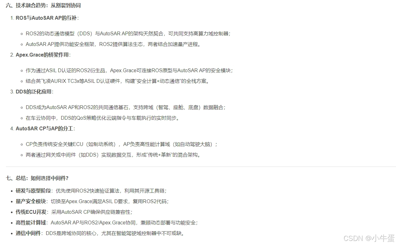 随着软件定义汽车的普及,AutoSAR AP和ROS2/Apex.Grace的融合将成为主流,而DDS作为底层通信协议将贯穿全域。未来,中间件的竞争不仅是技术性能的比拼,更是生态兼容性与安全认证体系的综合较量。车企需根据自身研发能力、供应链需求和安全目标,灵活选择技术组合,构建面向未来的自动驾驶中间件架构。