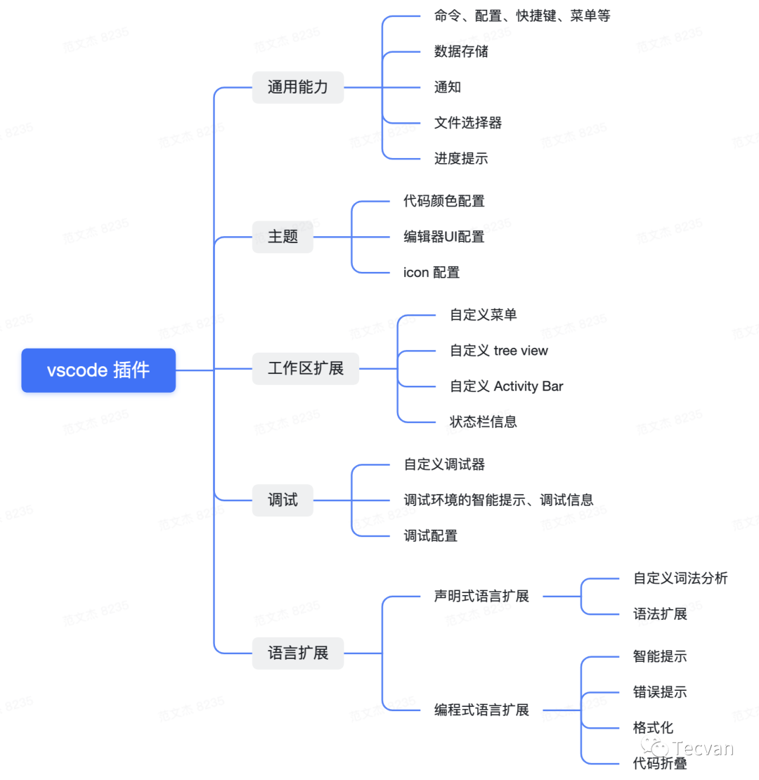 介绍 vscode 代码高亮原理之前,有必要先熟悉一下 vscode 的底层架构。与 Webpack 相似,vscode 本身只是实现了一套架子,架子内部的命令、样式、状态、调试等功能都以插件形式提供,vscode 对外提供了五种拓展能力: