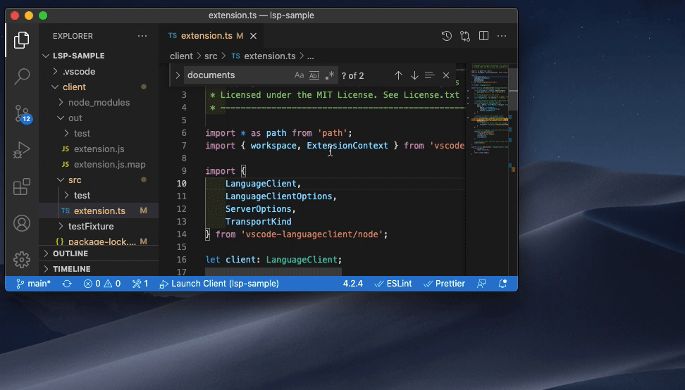示例 vscode-extension-samples/lsp-sample 中的 Client 入口代码,关键部分如下: