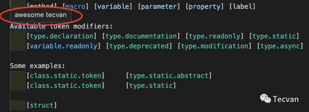 插件开发者可以自定义 scope 也可以选择复用 TextMate 内置的许多 scope ,包括 comment、constant、entity、invalid、keyword 等,完整列表请查阅 官网。