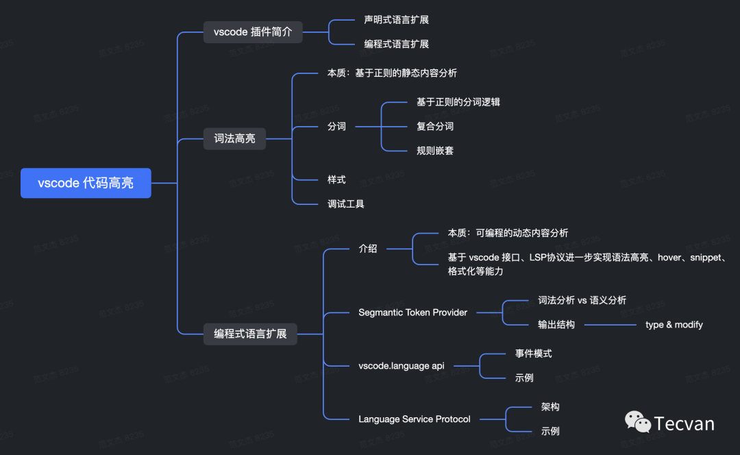 Vscode 中的声明式语言扩展基于 TextMate 词法分析引擎实现;编程式语言扩展则基于语义分析接口、vscode.language.* 接口、Language Server Protocol 协议三种方式实现,下面展开介绍每种技术方案的基本逻辑。