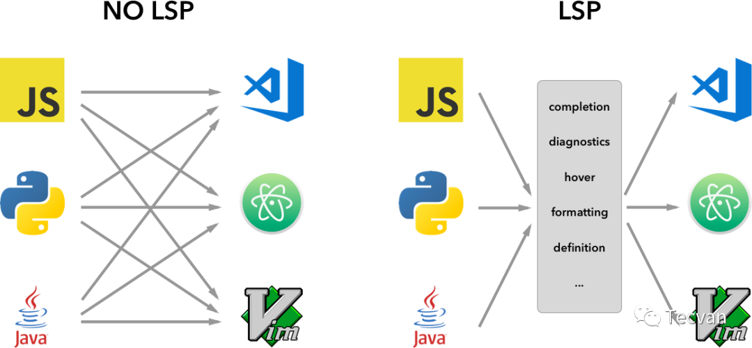 Vscode 的代码高亮、代码补齐、错误诊断、跳转定义等语言功能由两种扩展方案协同实现,包括:
