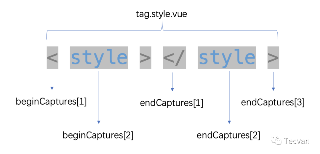 配置中,begin 用于匹配 <style> 语句,end 用于匹配 </style> 语句,且 <style></style> 整个语句被赋予 scope 为 tag.style.vue 。此外,语句中字符被 beginCaptures 、endCaptures 属性分配成不同的 scope 类型:
