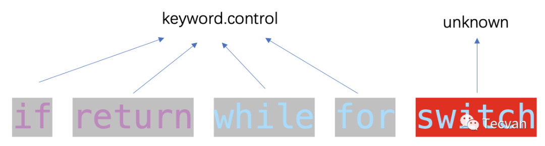 上述示例会将 if/while/for/return 关键词识别为 keyword.control 类型,但无法识别其它关键字: