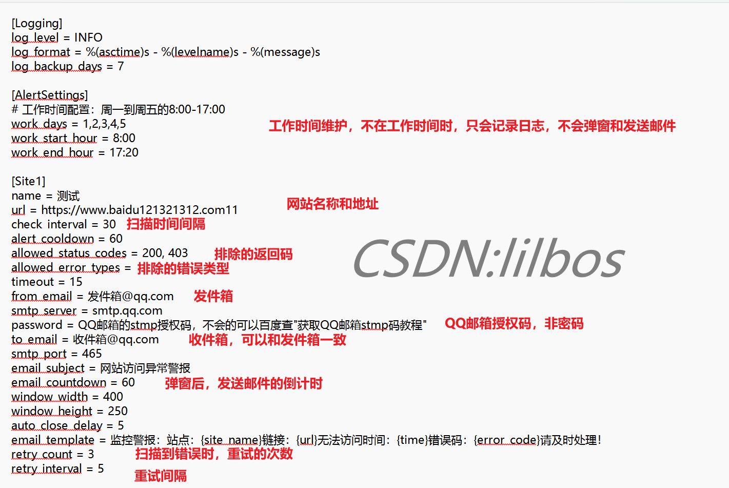 配置config.txt文件,如果要监控不同的网站,直接复制[Site1]整个文本,往下粘贴,修改配置即可