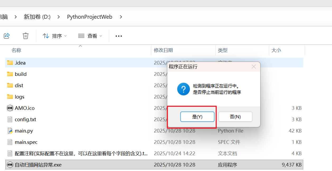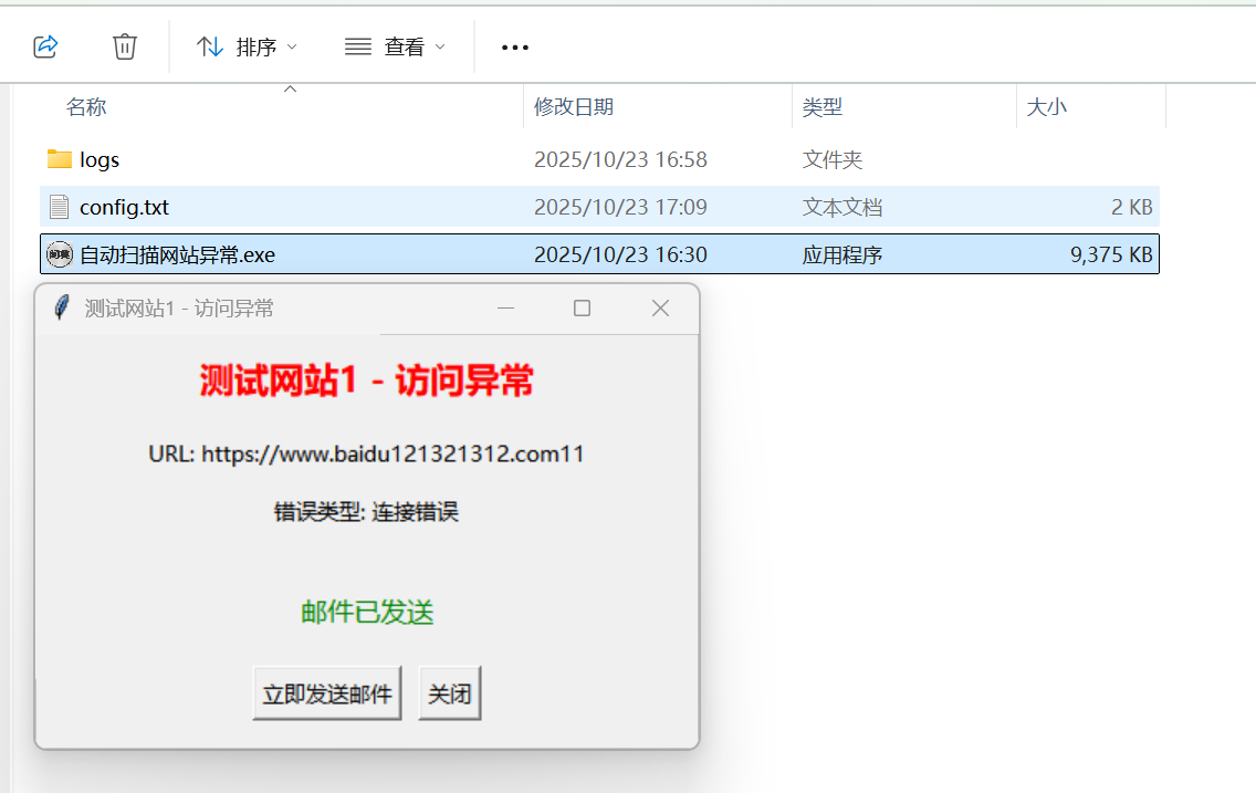 如果监控的网站异常,程序会弹窗提示,并且在倒计时内,如果没有关闭弹窗,就会发送邮件到维护好的邮箱中