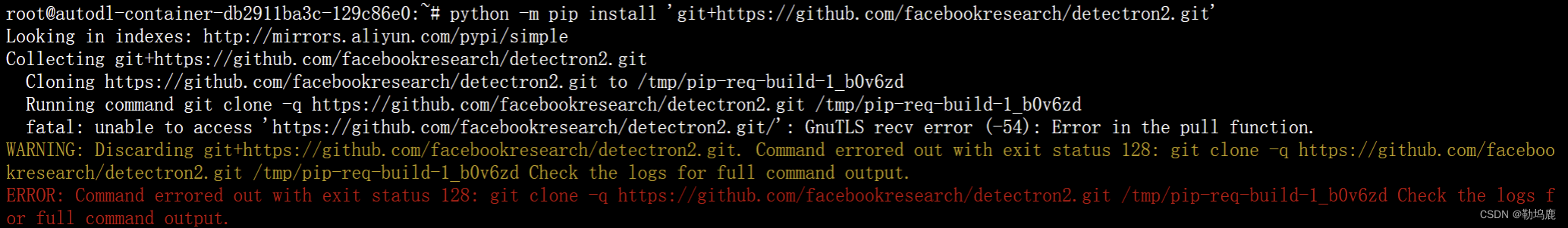 云服务器代码复现踩坑笔记 解决方案:1、看别人的博客在输入的命令之前加上让git忽略ssl证书错误问题没有解决2、最终解决应该是网络问题,多试几次就好了(笑哭)可能是我在安装的同时也在云盘下载数据集,导致了错误。