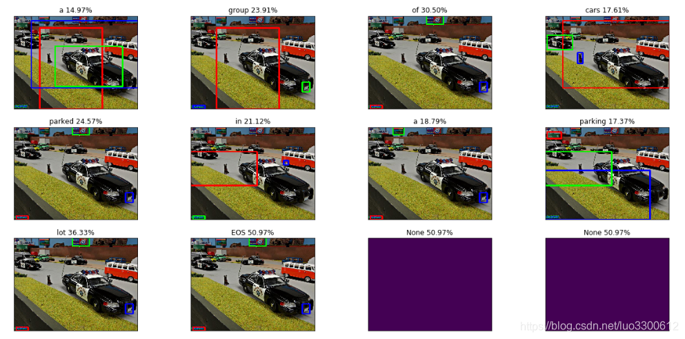 其中红、蓝、绿分别表示原始模型attention权值的最低的三个区域,在reverse之后,变成最高的,图片标题是当前生成的word,右边的数字是权值reverse之后三个区域的累计权值