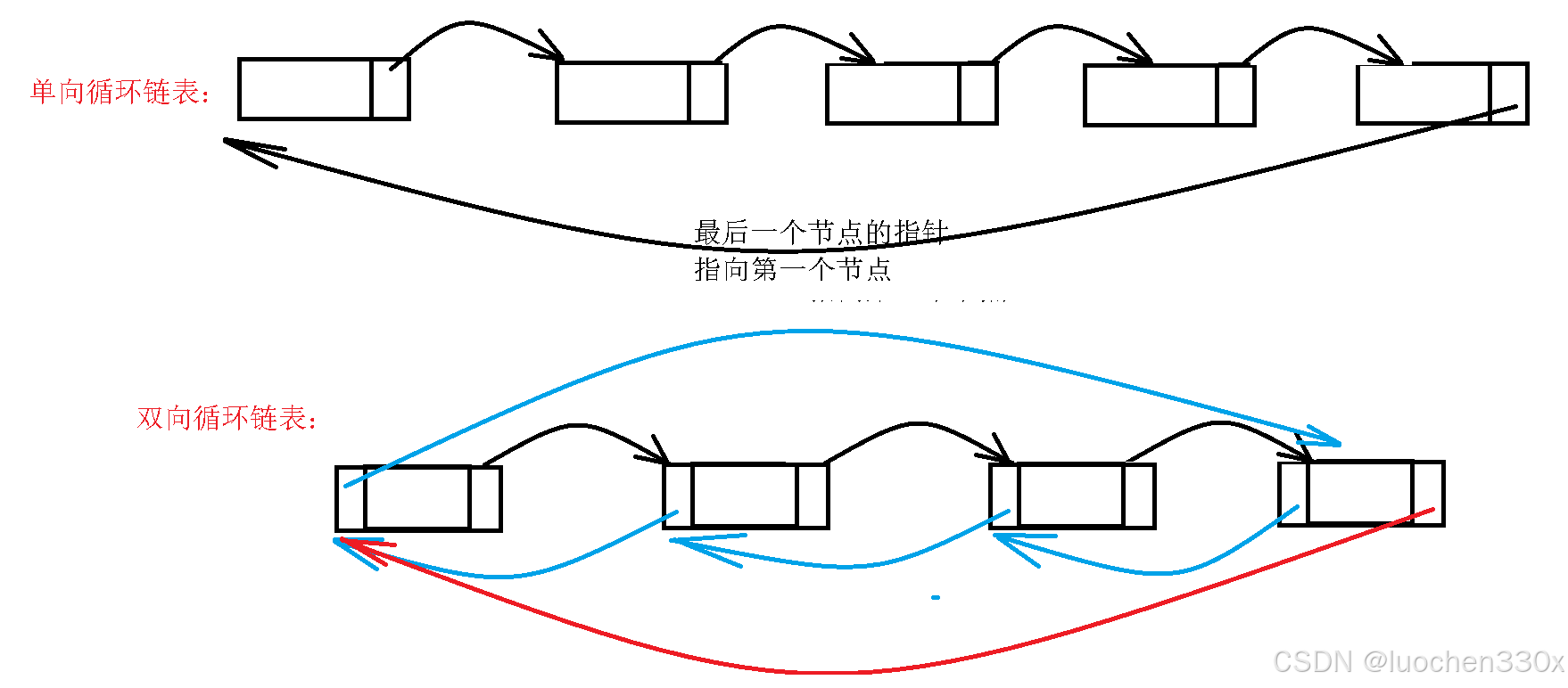 单向循环链表:将单链表最后一个节点的指针域指向第一个节点即可(或者指向头节点)