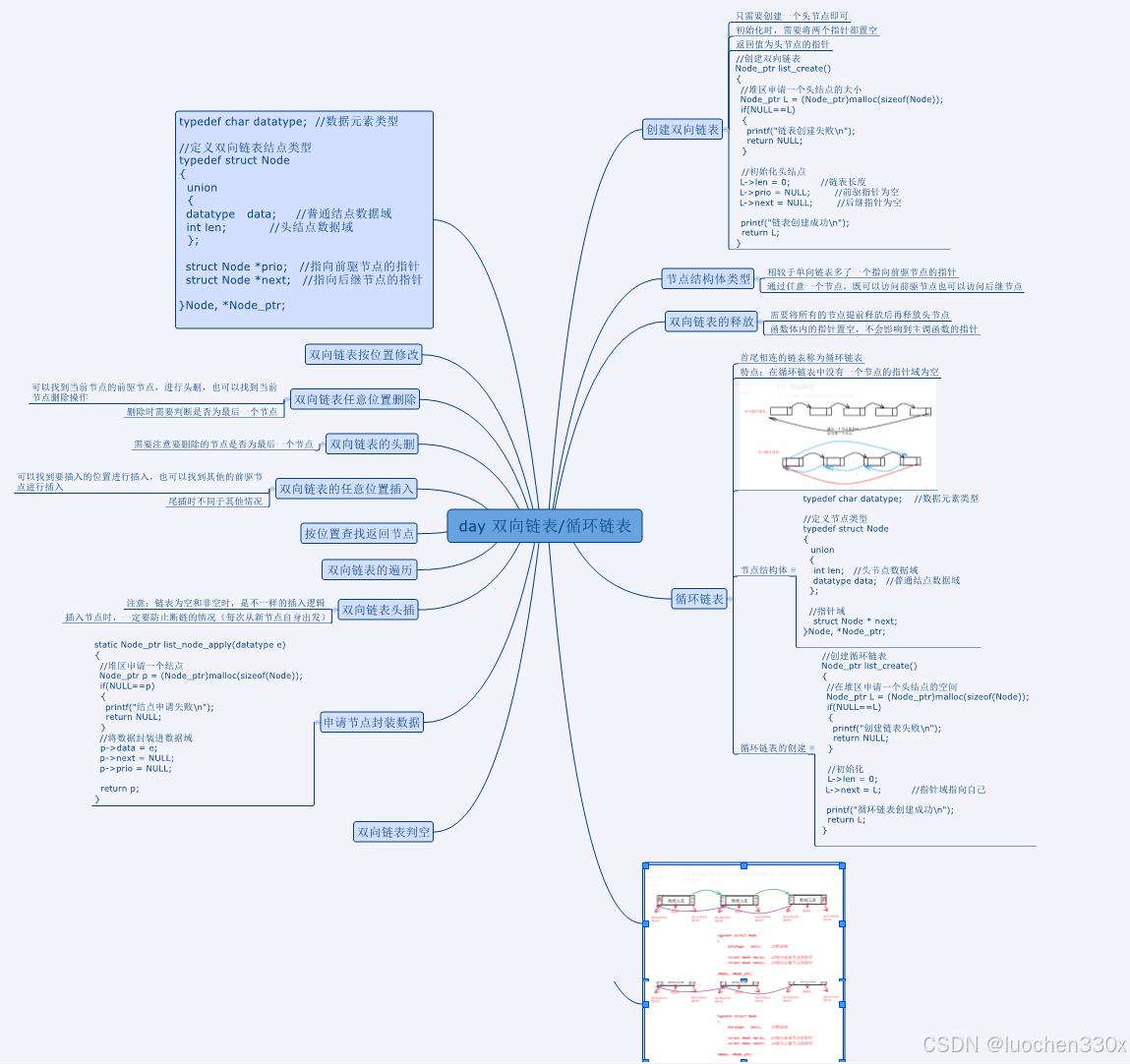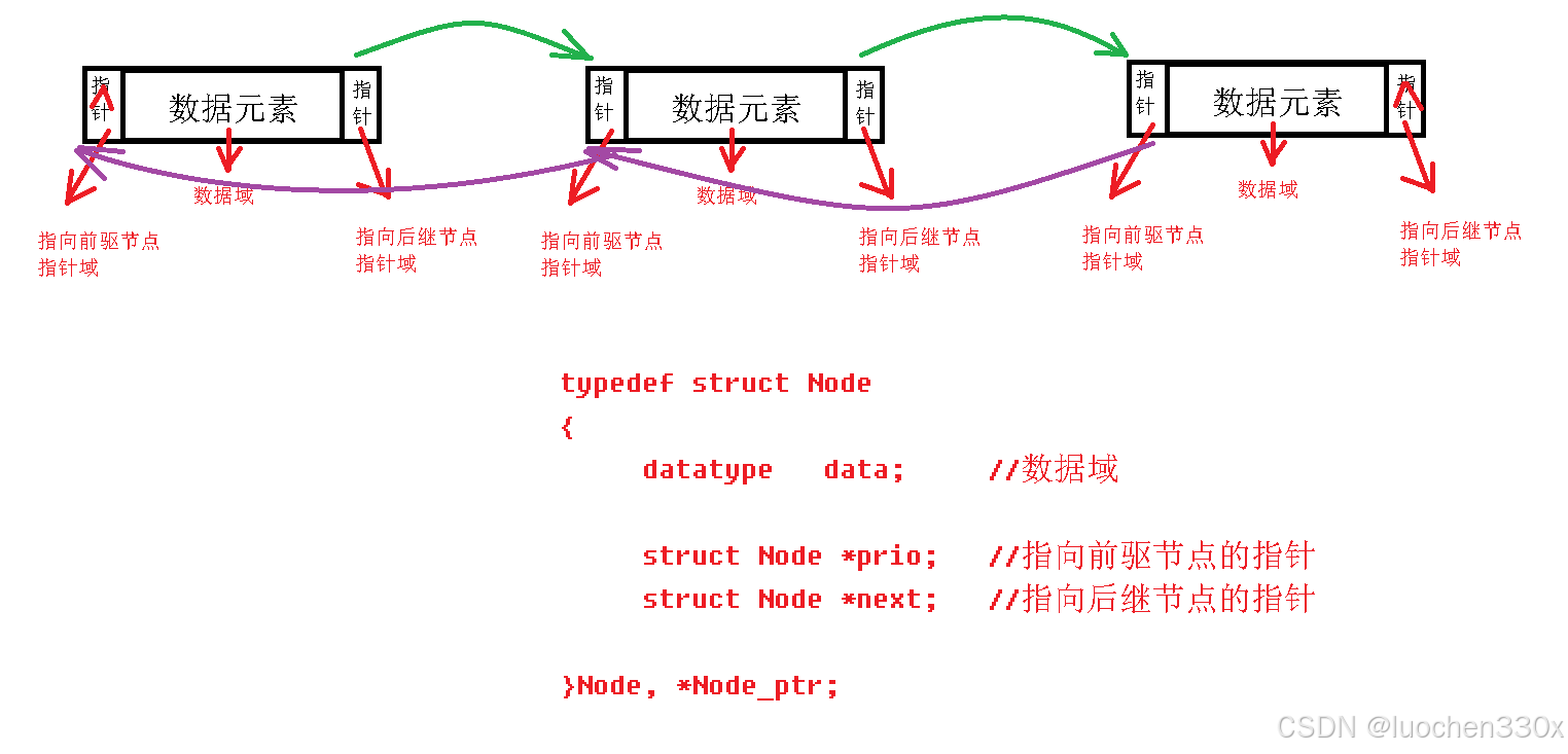 1.相比于单向链表的节点类型,多了一个指向前驱节点的指针