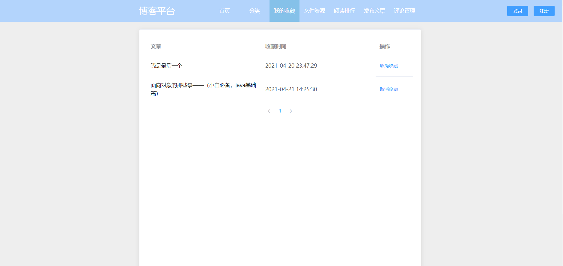 7.收藏管理模块:主要功能为文章收藏的新建,删除,更新,搜索,分页收藏数据五个功能。用户可以实时对他人以及个人的文章内容进行收藏,方便下次的搜索使用,以及更加快捷的转发。