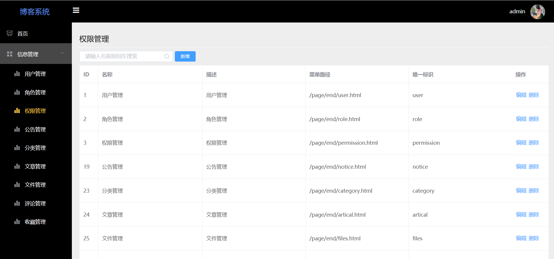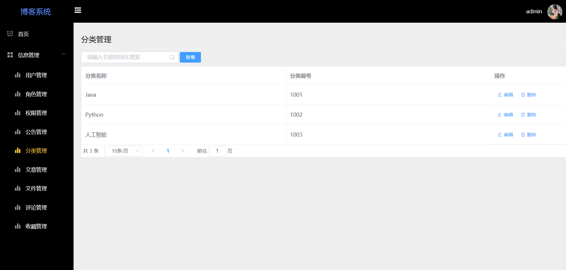 2.分类管理模块:主要功能为分类的新建,删除,更新,搜索分页分类数据五大模块,进行博客全局的分类整理管理以及分页展示各种分类数据。