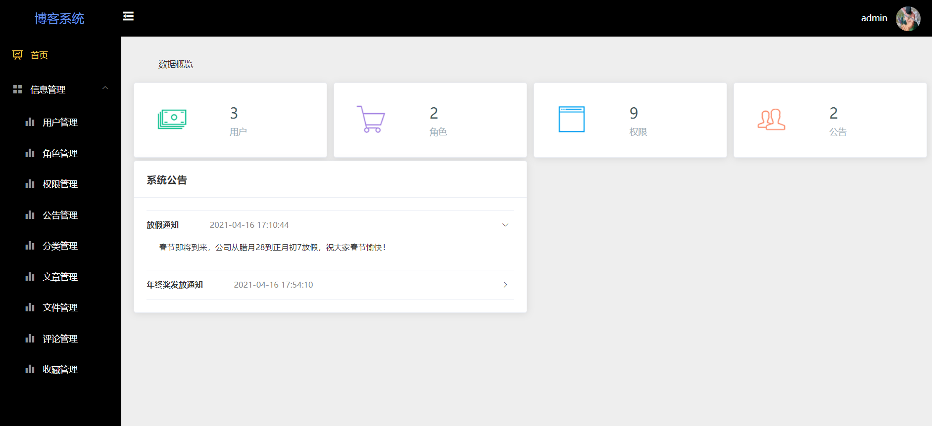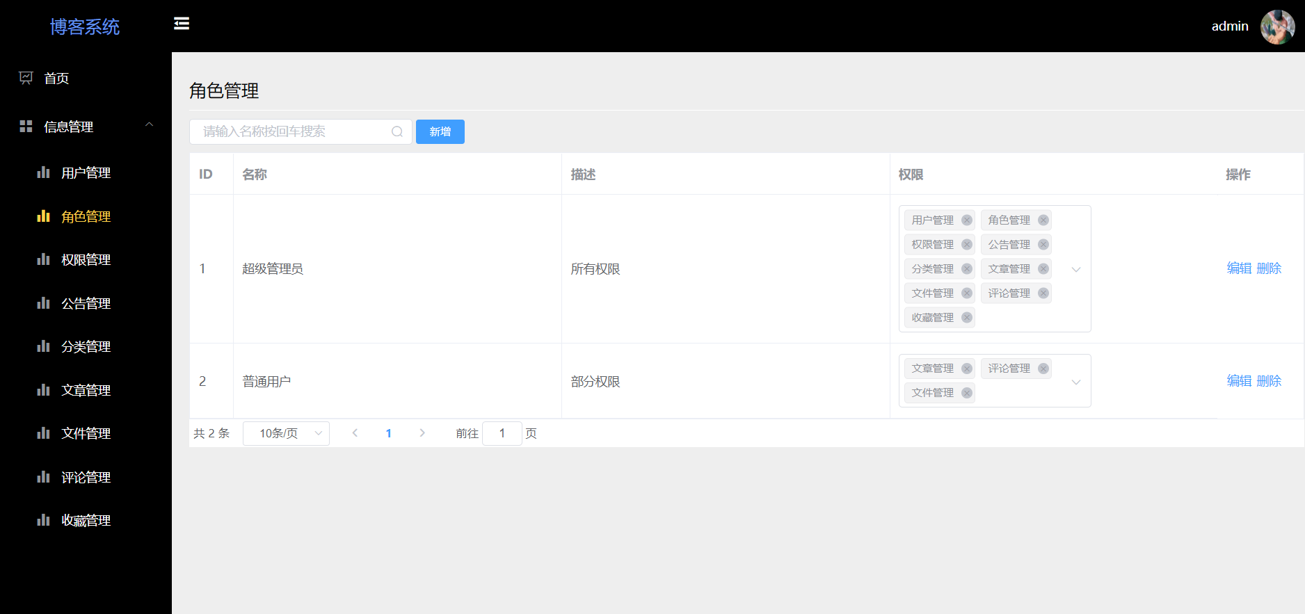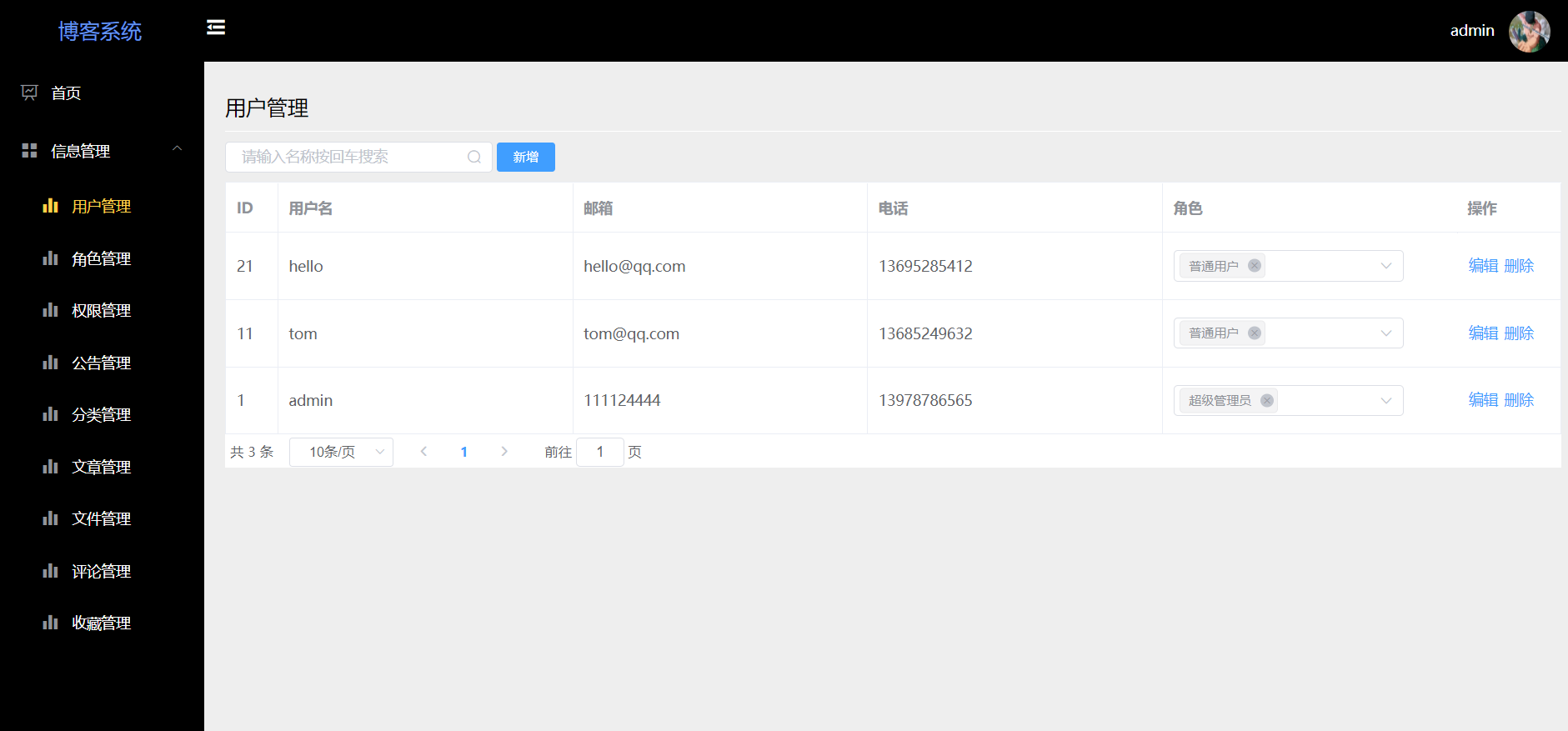 3.文章管理模块:主要功能为文章的新建,删除,更新,搜索,分页文章数据五大模块,进行用户个人的文章内容的撰写,文章的编辑,可以使用富文本,图片视频的上传使用。