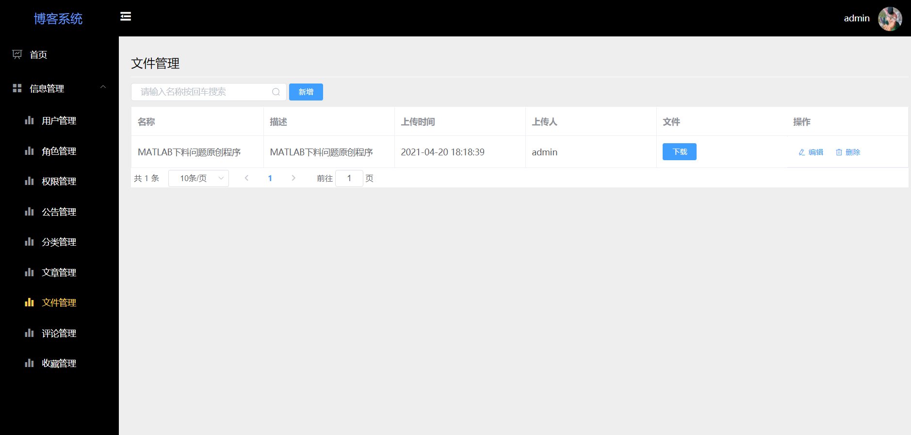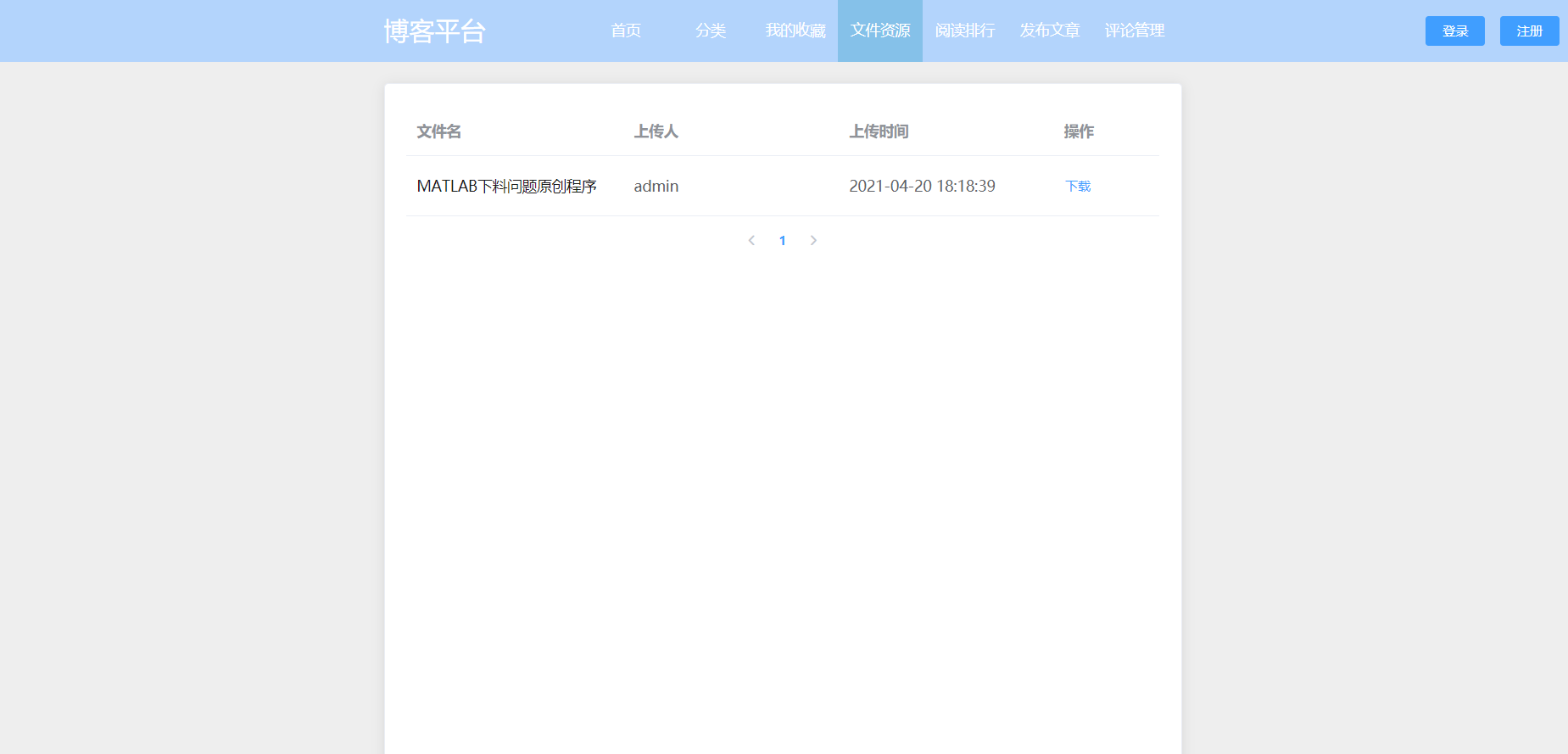 5.文件管理模块:主要功能为文件的上传,下载,更新,删除分页展示文件数据五大模块。文件内容可以为图片笔记,视频内容,可以用来进行文件的及时存储以及更新,删除,长期的存储,对不同分类的文件进行整理筛选。