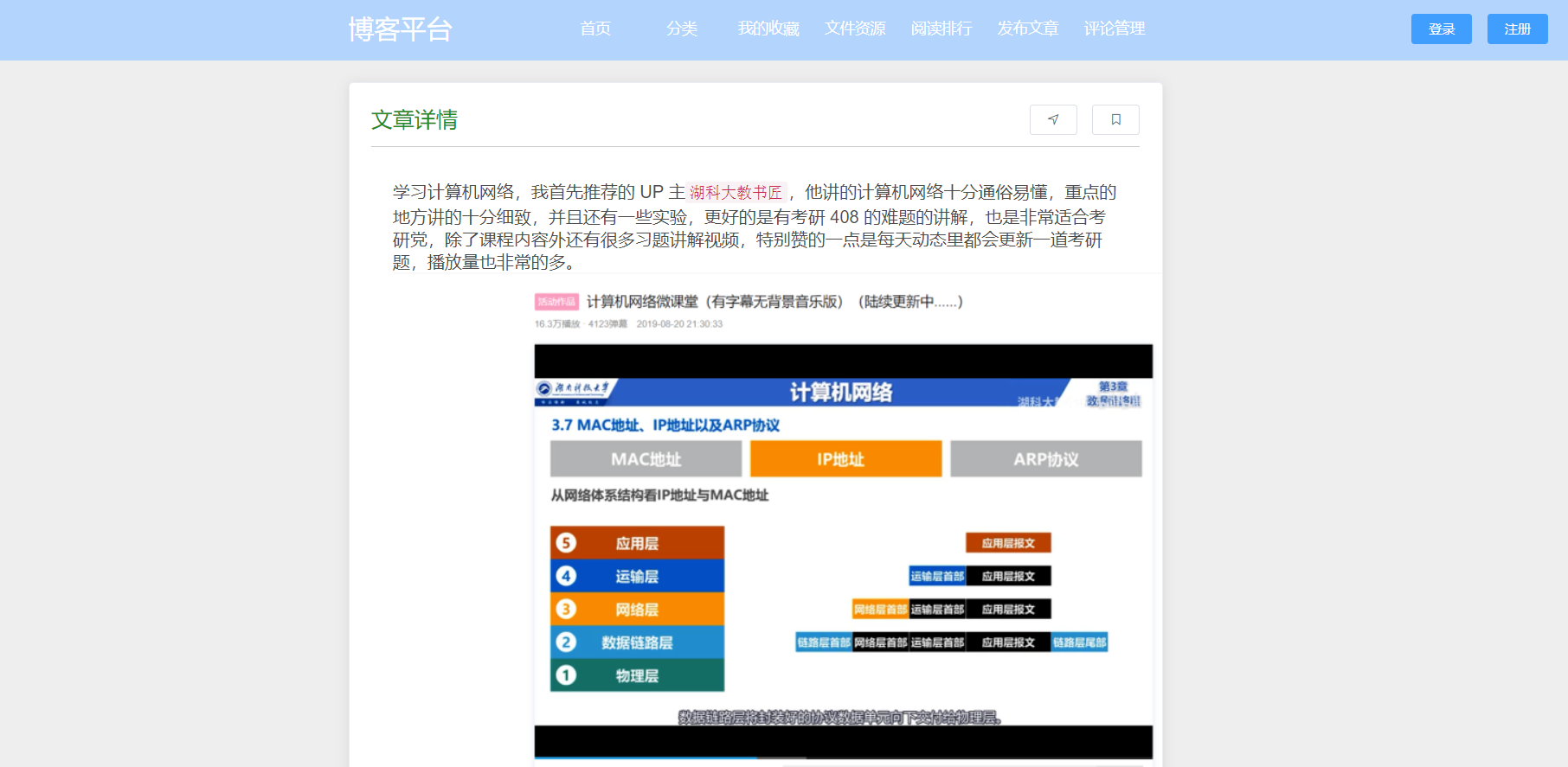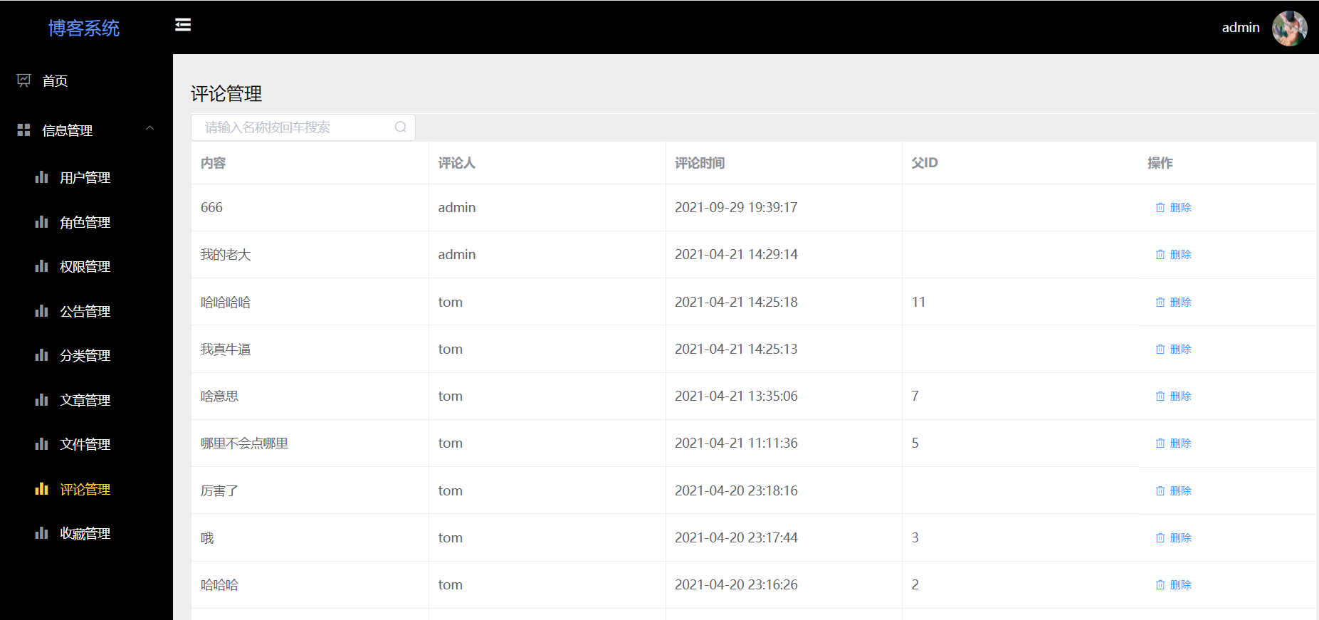 4.评论管理模块:主要功能为添加评论,删除评论,搜索评论,分页展示评论数据四大模块。实现对他人的文章内容分享的及时评论和对他人评论的回复,对评论内容的追加和查看评论信息的功能。