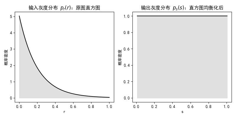 直方图均衡化的目标是让图像的灰度分布变得均匀,即让每个灰度级出现的概率大致相等。这样做的理论基础是,一个具有均匀灰度分布的图像拥有最高的熵,因此可以呈现出最多的信息和最高的对比度。在连续域中,不管原始图像的直方图分布如何,我们总是可以将其变换为均匀分布直方图,如下图: