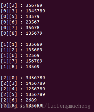 sudoku[i][j]对应的排除信息保存在exclude[i * 10 + j]中,它是一个包含9个元素的字符数组。exclude[i * 10 + j][k]保存的是sudoku[i][j]中是否可以放置k + 1,如果exclude[i * 10 + j][k] = 0表示可以放置k + 1,否则表示不能放置k + 1。