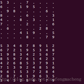 void print_sudoku() 打印整个数独棋盘,用两层循环就可以实现,要注意的是,在程序中将1-9当作字符还是整数来处理,这里将1-9当作整数来处理,因此,它们虽然保存在char型数组中,在输出的时候,如果是".",就要当作字符来输出,否则,就要作为整数来输出。