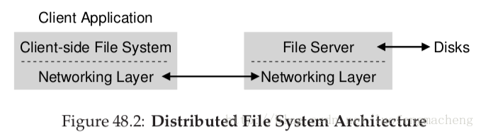 现在,让我们来研究一个基本的分布式文件系统的架构。一个简单的客户机服务器分布式文件系统比我们已经研究过的文件系统有更多的组件。在客户端,客户端程序通过客户端文件系统访问文件和目录。客户端程序为了获取服务器上的数据可以向客户机发送系统调用。这样,对于客户端程序而言,分布式文件系统跟本地文件系统没什么不同,除了性能,因此,从这个方面说,分布式文件系统的一个目标是可以透明地访问文件,毕竟,谁想用一个需要另外一套API来使用的文件系统呢?客户端的文件系统需要对这些系统调用进行响应。比如,如果客户端程序发出一个read()请求,客户端文件系统可能会想服务器文件系统发送一个消息来读取一个特定的块,然后,文件服务器会从磁盘(或者缓存)中读取块,然后将请求的数据构成一条消息发送给客户端。客户端文件系统会将数据拷贝到read()系统调用提供的用户缓冲区中,一个请求过程就结束了。注意,客户端在接下来请求的同一个块可能会缓存在内存或者本地磁盘中,因此,最好的情况下,没有产生任何网络流量。