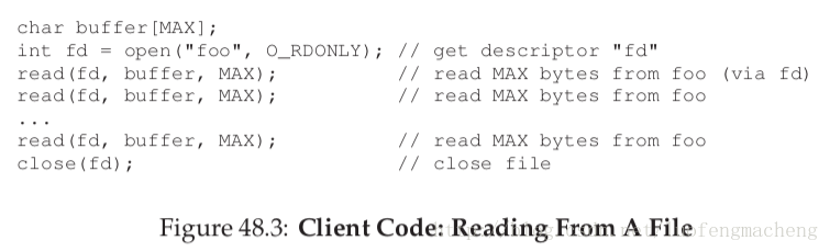 现在,假设,客户端文件系统打开一个文件,向服务器发送一个协议消息,说“打开文件foo,返回给我文件描述符”。然后,文件服务器打开文件,将文件描述符回送给客户端。在接下来的读操作中,客户端程序使用文件描述符调用read()系统调用;客户端文件系统将文件描述符封装成一个消息,然后将消息发送给文件服务器,说“从我发给你的文件描述符指向的文件读取一些字节”。