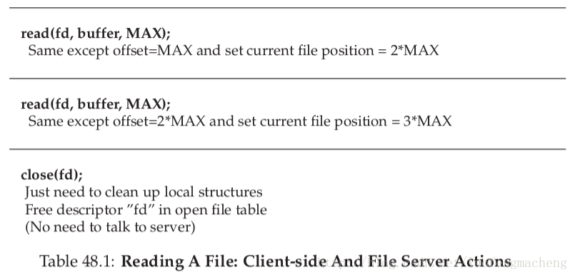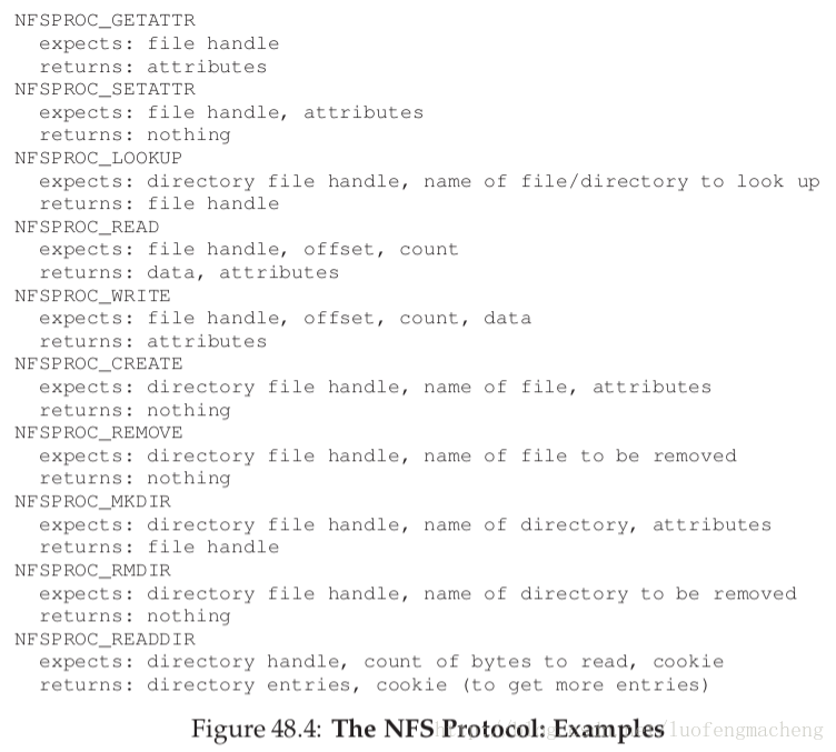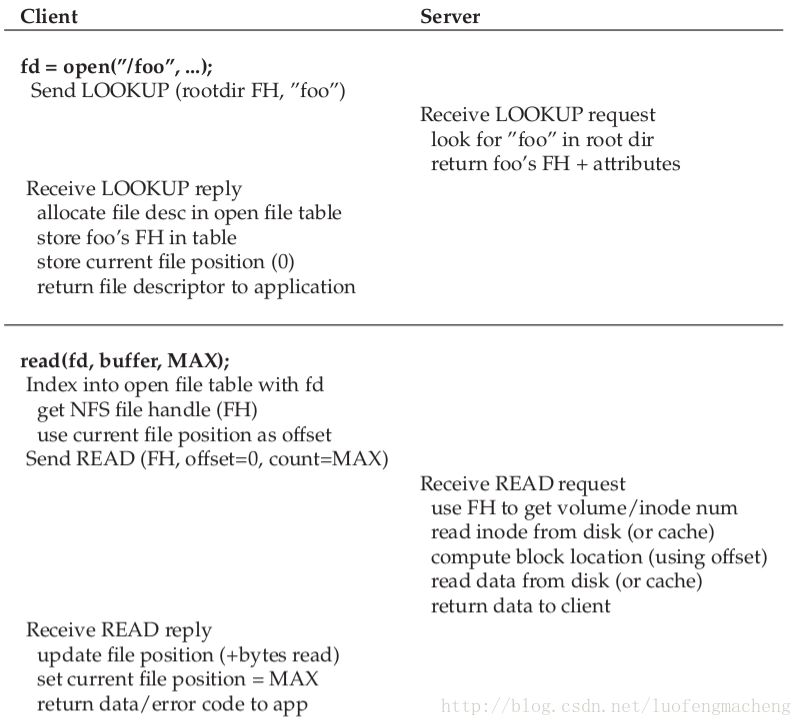 图中包含一些注释。首先,需要注意的是,客户端如何跟踪文件访问操作的对应状态,包括文件描述符与NFS文件句柄的对应和当前文件指针。这能够使得客户端将每个读请求转换成合适的读协议消息,该协议消息告诉服务器从文件中读取哪些字节。读取操作成功了,客户端会更新当前文件位置;接下来的读取操作针对同一个文件句柄,但是偏移量不同。