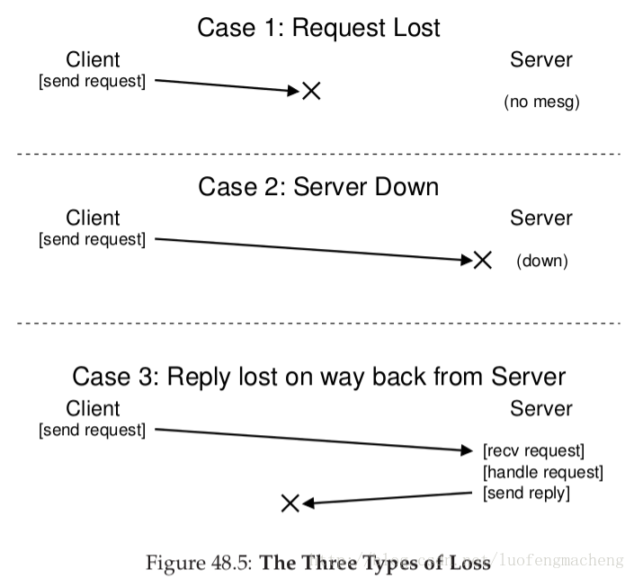 当客户端向服务器发送一条消息,有时收不到回应。造成响应失败的原因有很多。有时,这条消息可能被网络丢弃了;网络丢掉了消息,那么,无论是请求还是响应都丢失了,客户端永远也收不到响应。还有可能是服务器崩溃了,服务器就不会响应消息。之后,服务器重启,但是,所有的请求已经丢失了。在所有的情况下,客户端留下了一个问题:当服务器没有及时地响应,客户端应该怎么做呢?