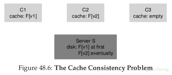缓存一致性问题可以用两个客户端和一个服务器的系统来解释。假如客户端C1读一个文件F,然后在它的本地缓存中保存这个文件的一个副本。现在,另一个客户端C2重写了文件F;我们将这个F文件的新版本称为F(v2),之前的文件F称为F(v1)。最后,第三个客户端C3,它还没有访问过F。你可能看到问题所在了。事实上,这里有两个子问题。第一个子问题是,C2可能在将数据写到服务器之前,将它缓存一段时间;在这种情况下,F(v2)存储在C2的内存中,从其它客户端访问F时读取的数据是F(v1)。这样,将写操作的数据缓存在客户端,其它的客户端可能会读取到老版本的数据,这并不是所期望的行为;事实上,假如你登陆了C2,更新F,然后登陆C3,尝试读取这个文件,所读取的文件是老版本的副本。当然,这种情况让人不爽。我们称缓存一致性问题的这个方面为更新可见性;何时在一台客户端上进行更新操作,然后在其它客户端上可见呢?