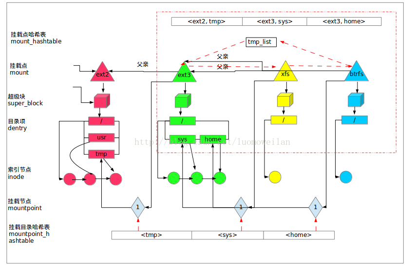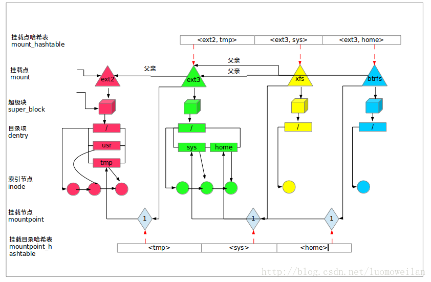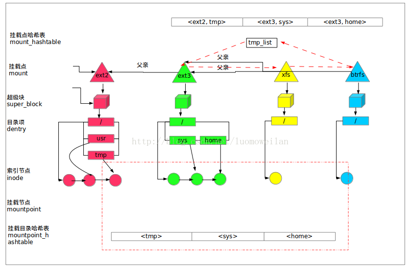 这四种文件系统存在以下几种关系:ext3、xfs和btrfs文件系统都存在于挂载点哈希表中;ext3的父文件系统是ext2,ext3是ext2的子文件系统;xfs和btrfs的父文件系统是ext3,exfs和btrfs是ext3的子文件系统。同时,三个挂载节点存在于挂载目录哈希表中,对应的挂载目录分别是tmp、sys和home。