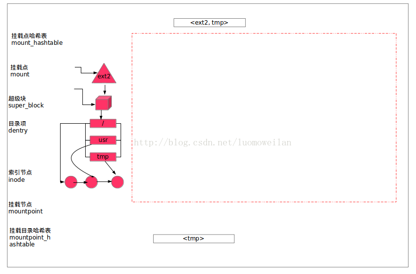 从图中可以看到tmp、sys和home三个挂载节点已经从挂载目录哈希表中删除了,并且挂载节点structmountpoint数据结构也被释放了。