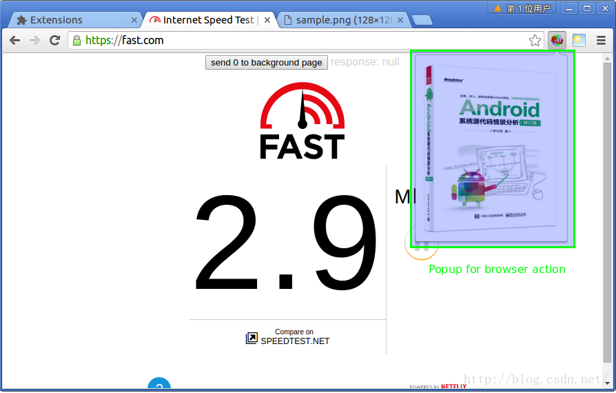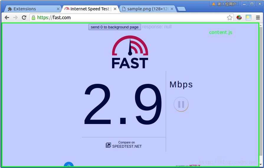 前面提到,Page action example的清单文件还指定了一个Content Script,即content.js。这个content.js通过matches字段指定仅对URL为“https://fast.com/”的页面生效,也就是它只会注入到URL为“https://fast.com/”的页面中去。注入的内容如下所示: