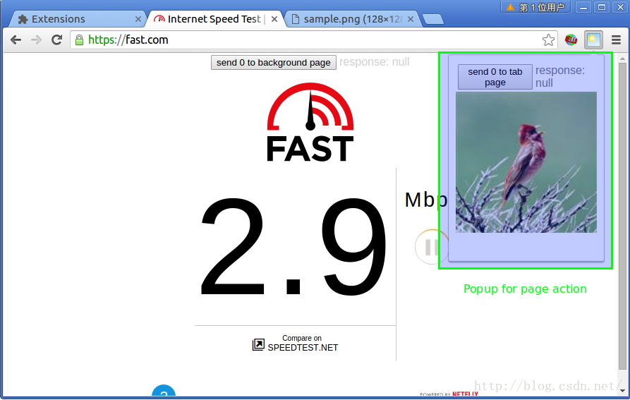这样,通过不断地点击popup.html页面中显示为"send to tab page"的Button,就可以不断地与当前激活的Tab通信。后面我们可以看到,实际上是与在Tab中加载的Content Script通信的。
