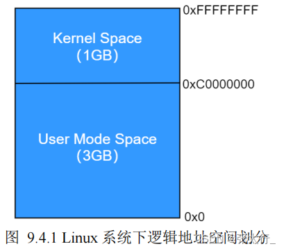 上一小节讨论了 C 语言程序的构成以及运行时进程在内存中的布局方式,在 Linux 系统中,采用了虚拟内存管理技术,事实上大多数现在操作系统都是如此!在 Linux 系统中,每一个进程都在自己独立的地址空间中运行,在 32 位系统中,每个进程的逻辑地址空间均为 4GB,这 4GB 的内存空间按照 3:1 的比例进行分配,其中用户进程享有 3G 的空间,而内核独自享有剩下的 1G 空间,如下所示: