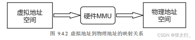 学习过驱动开发的读者对“虚拟地址”这个概念应该并不陌生,虚拟地址会通过硬件 MMU(内存管理单元)映射到实际的物理地址空间中,建立虚拟地址到物理地址的映射关系后,对虚拟地址的读写操作实际上就是对物理地址的读写操作,MMU 会将物理地址“翻译”为对应的物理地址,其关系如下所示: